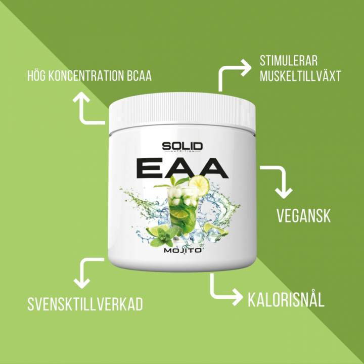 SOLID Nutrition EAA er et aminosyretilskud med en høj koncentration af BCAA, fremstillet i Sverige af svenske råvarer og fri for både gluten, laktose, animalske ingredienser og sukker. Og ikke nok med det – SOLID Nutrition EAA smager også fantastisk! Faktisk kan det være markedets absolut bedst smagende aminosyrer. Prøv selv!